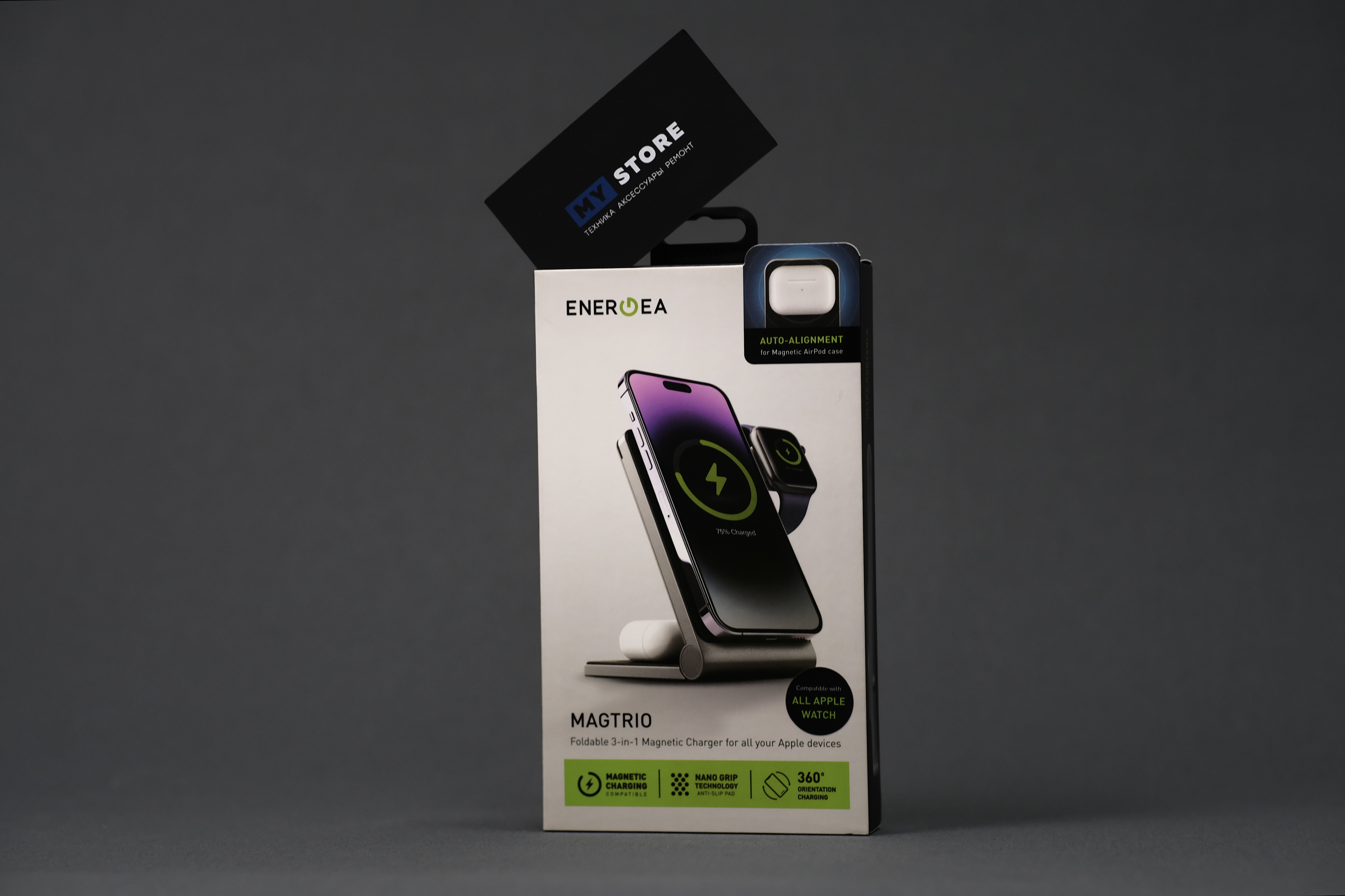 Тонкое беспроводное зарядное устройство EnergEA MagTrio 3 в 1 сочетает в себе мощь тройной беспроводной зарядки и удобство магнитного крепления. Складная конструкция предназначена для одновременной работы с тремя устройствами от Apple и предусматривает три зоны - для зарядки iPhone Magsafe, кейса беспроводных наушников Airpods и умных часов Apple Watch. Встроенные магниты Magsafe гарантируют точное совмещение телефона как в портретном, так и в ландшафтном режимах. Светодиодный индикатор отображает статус работы зарядки.