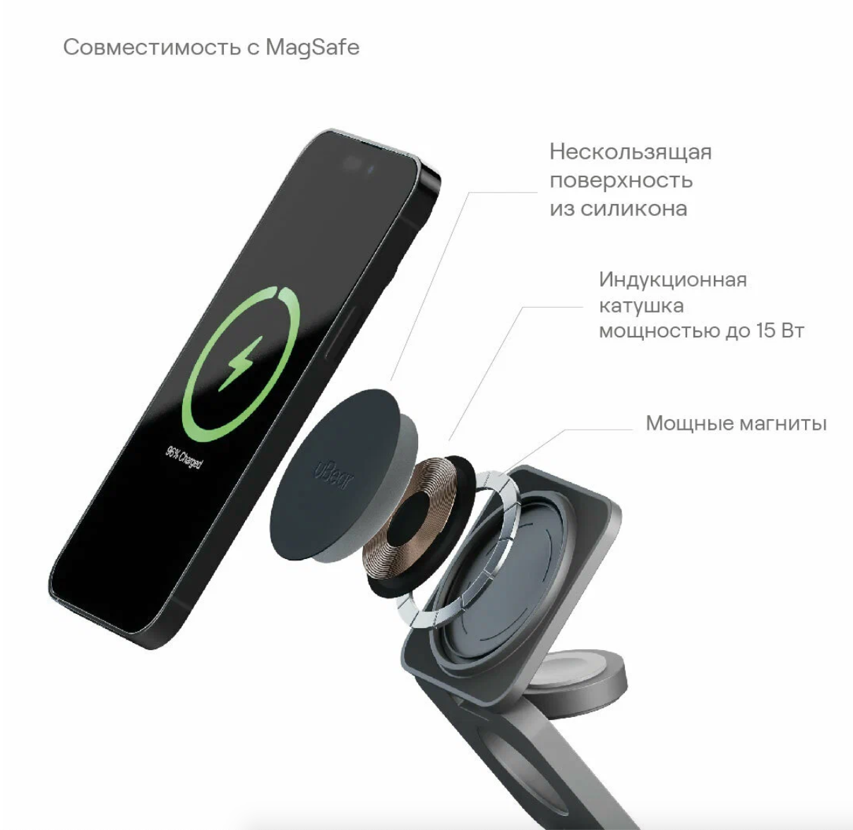 - Магнитное крепление: устройство оснащено магнитами, которые позволяют надежно закрепить смартфон на зарядной поверхности.