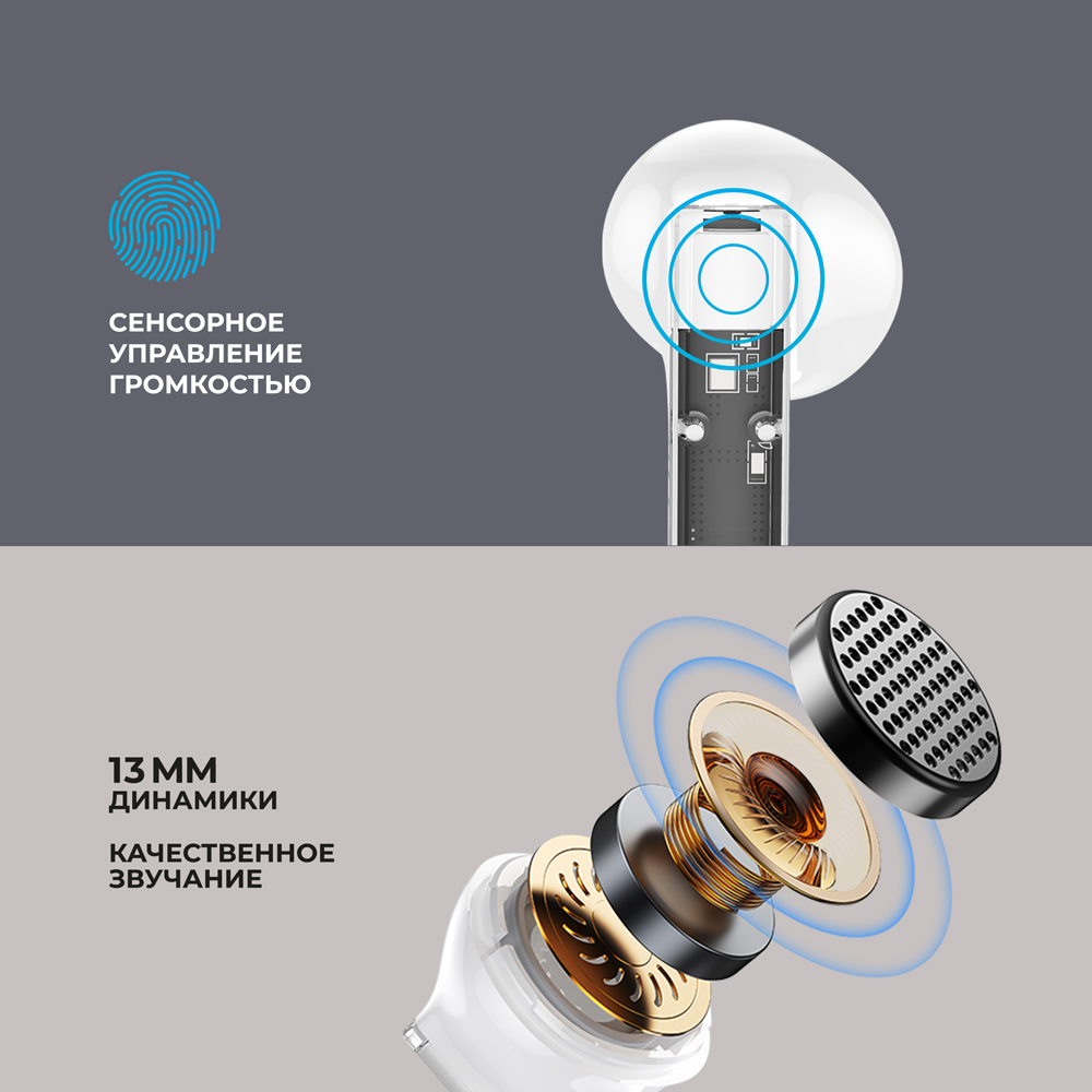 После привязки к вашему устройству наушники будут подключаться к нему автоматически, и управлять ими можно при помощи мультисенсора. Корпус зарядного кейса выполнен из ударопрочного ABS-пластика и оснащен LED-индикатором. Кроме того, наушники можно использовать с вашими любимыми голосовыми помощниками.