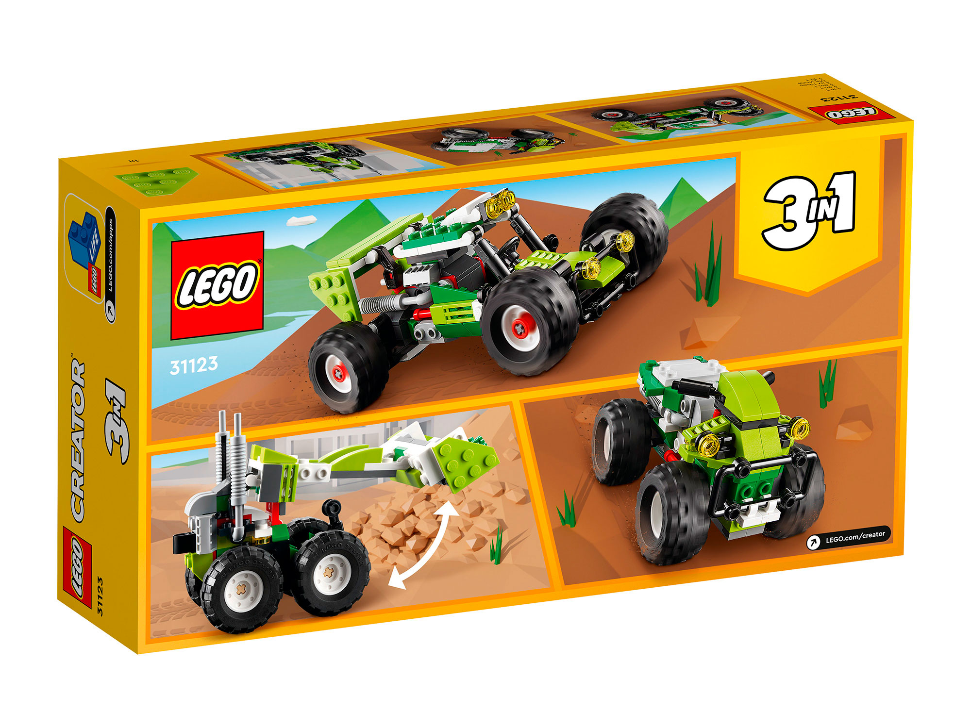 Приготовьтесь к удивительным приключениям с тремя различными машинами. Садитесь за руль внедорожного багги с огромными шинами, чтобы промчаться по песчаным дюнам или лесным тропам. Когда вы остановитесь, перестройте его в мощный погрузчик для подъёма грузов, в вездеход для новых захватывающих гонок, или используйте воображение, чтобы собрать совершенно новую модель. С этим набором «3 в 1» приключения не прекращаются!
