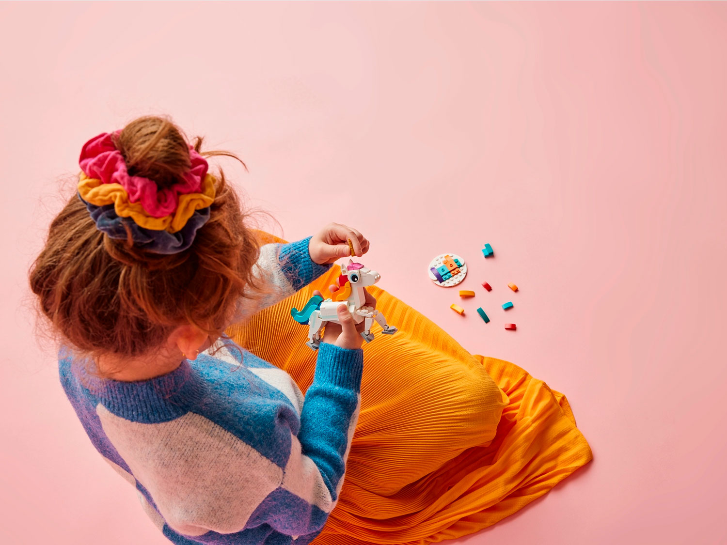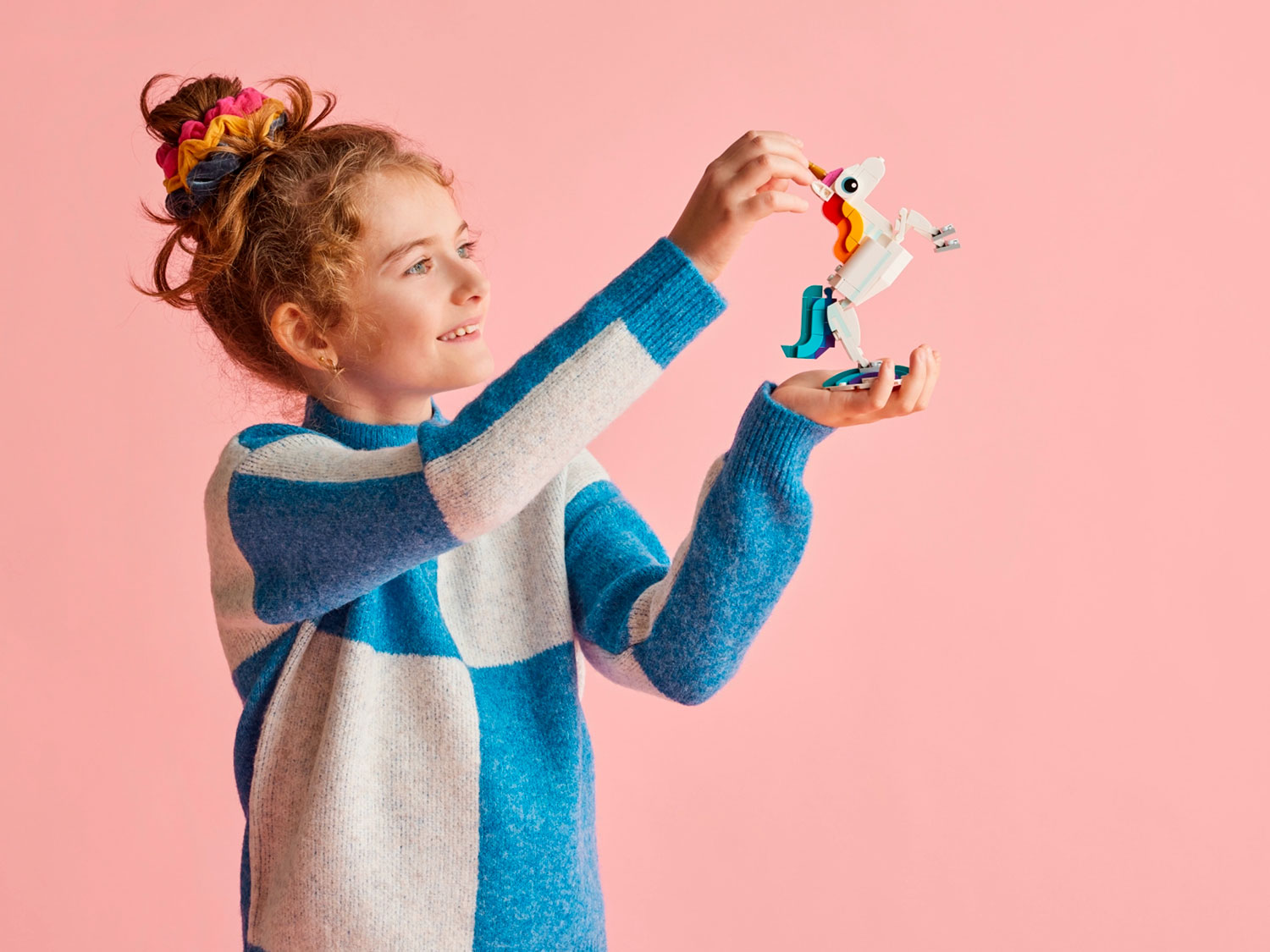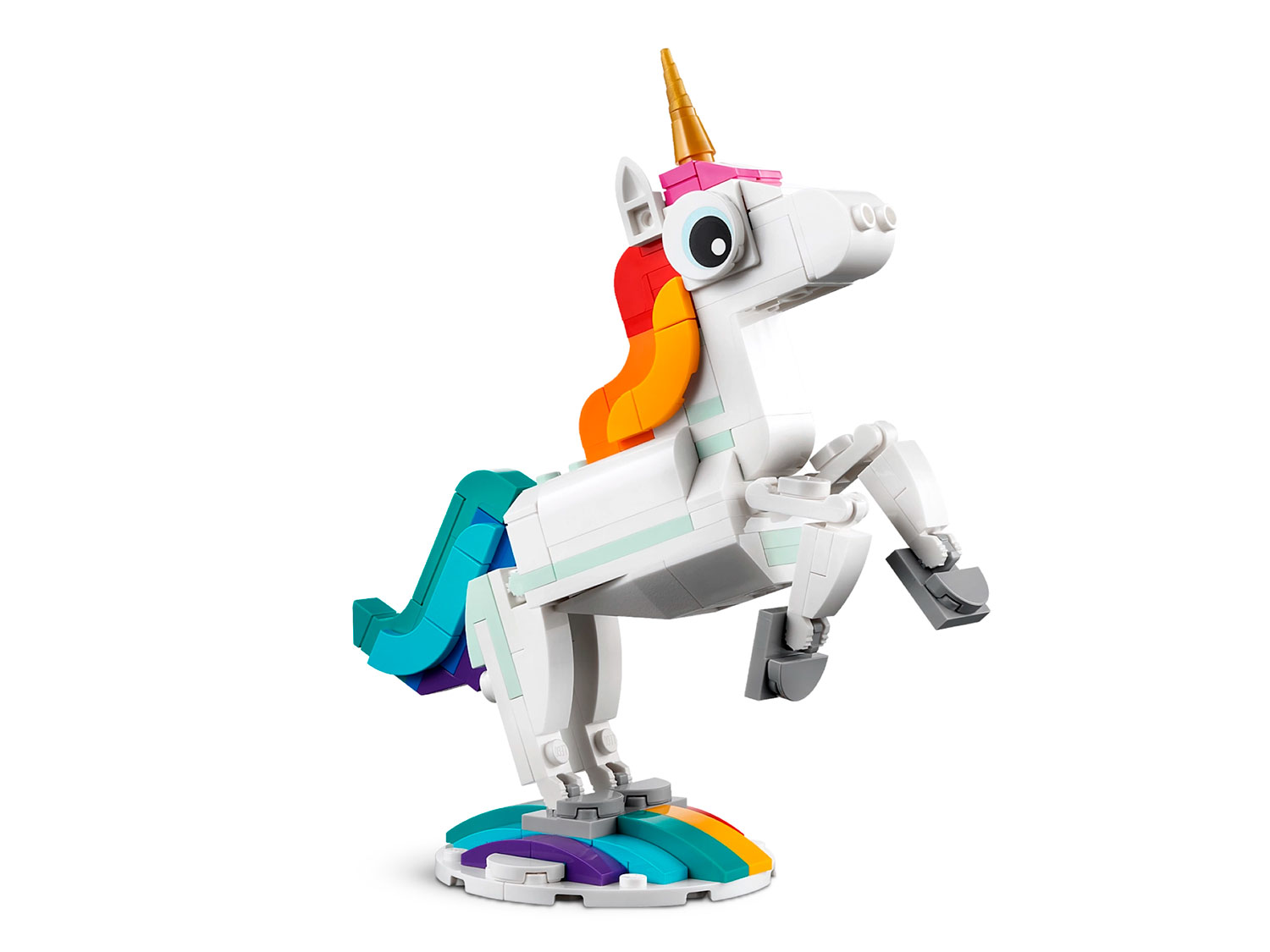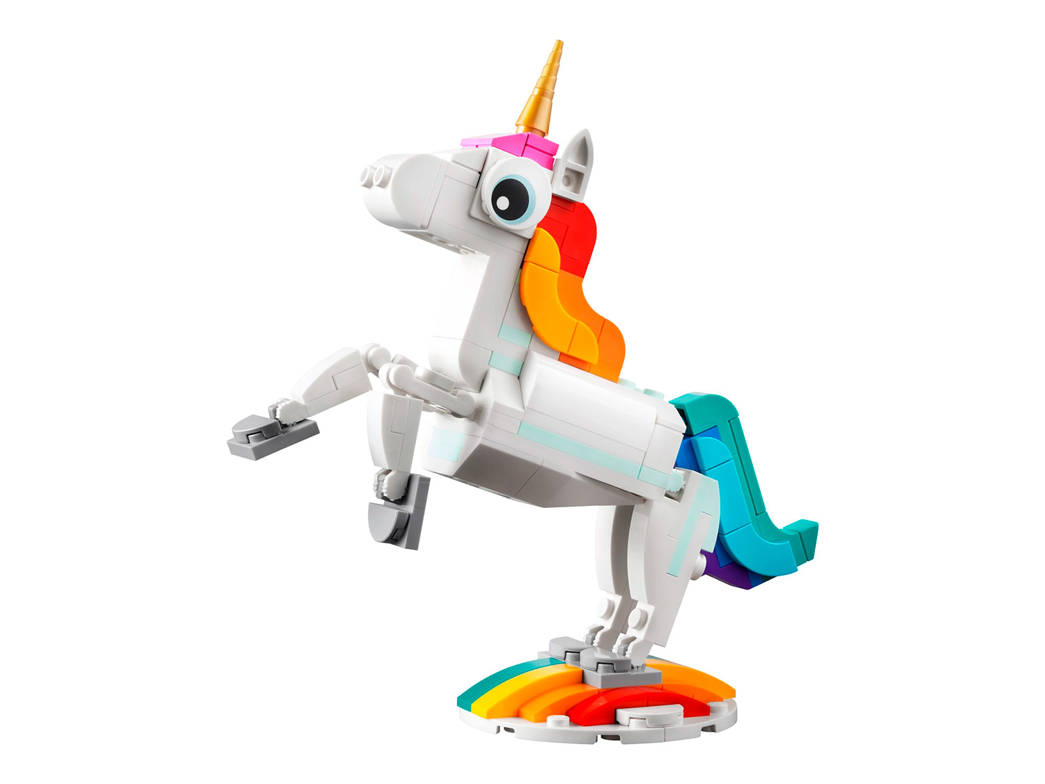 Детей в возрасте от 7 лет с богатым воображением можно перенести в сказочную страну для увлекательных приключений с этим набором LEGO® Creator 3 в 1 «Волшебный единорог» (31140). В нем есть игрушечный единорог с золотым рогом, красочным хвостом, подвижными ногами и копытами. Его можно установить в 2 разных положениях: поставить на 4 ноги или поднять на 2 задние ноги для культовой позы и продемонстрировать на радужной подставке набора.