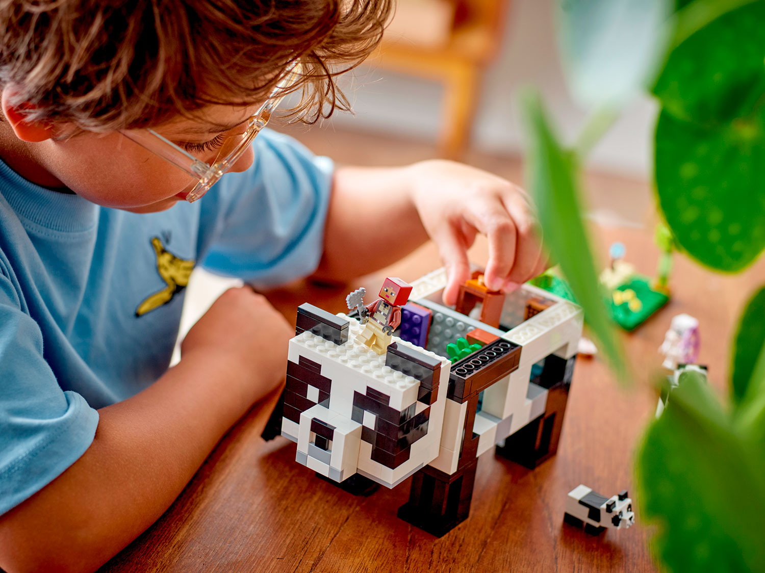 Практический игровой процесс — дети строят гигантский дом панды, где они могут выполнять творческие миссии Minecraft®, сражаться с враждебно настроенными злоумышленниками и заботиться о животных.