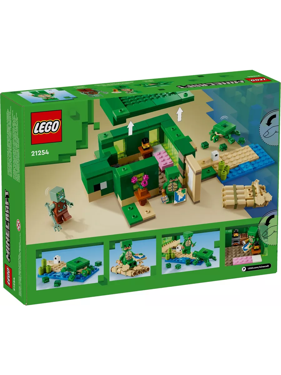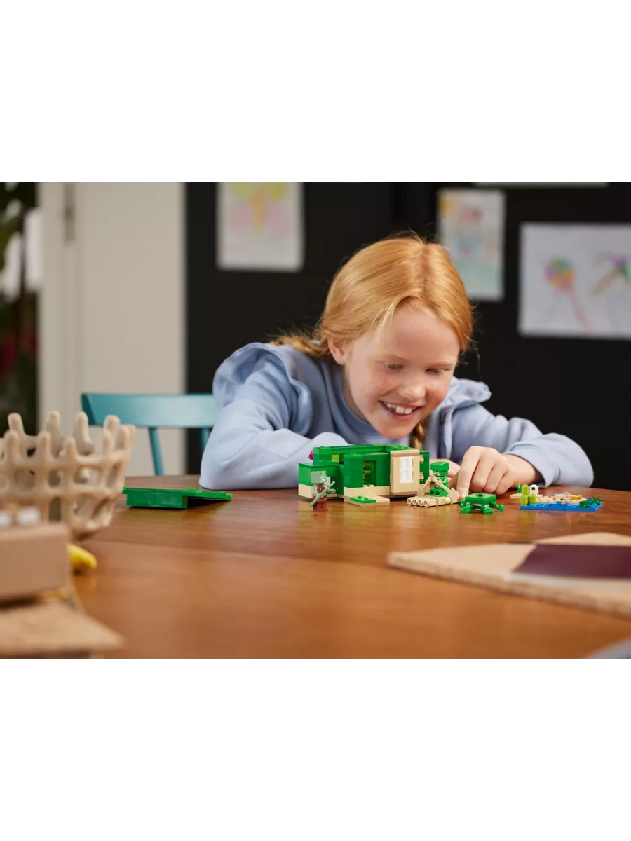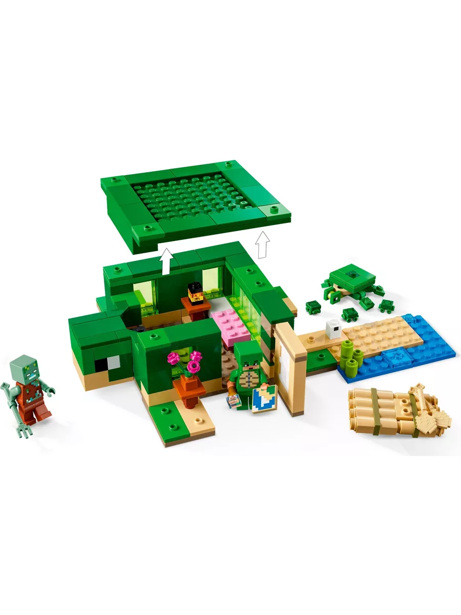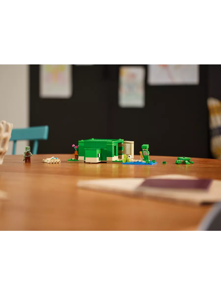 Игроки строят дом в форме черепахи прямо из Minecraft с окнами, фонарями, дверью, кроватью, столом, верстаком и плитой. Подъемная крыша обеспечивает легкий доступ внутрь. Снаружи есть пляж с сахарным тростником, черепашьими яйцами и бамбуковым плотом с веслами. Также есть знаменитые фигурки и мобы Minecraft: воин в черепашьей шкуре и шлеме, утопленник с трезубцем, черепаха, питающаяся водорослями, и три маленьких черепахи. Аксессуары также включают карту и телескоп. Любители активного отдыха, творческого конструирования и ухода за животными будут в восторге от этой универсальной игрушки. Приложение LEGO Builder позволяет строителям масштабировать и вращать модели в 3D, а также отслеживать их прогресс.