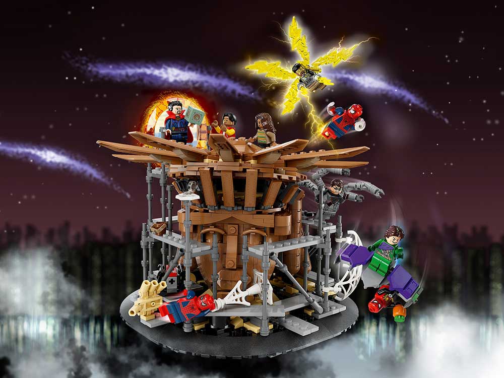 Этот игровой набор с обзором в 360 градусов воссоздает боевые действия с перебрасыванием паутины из фильма Marvel Studios «Человек-паук: Нет пути домой».