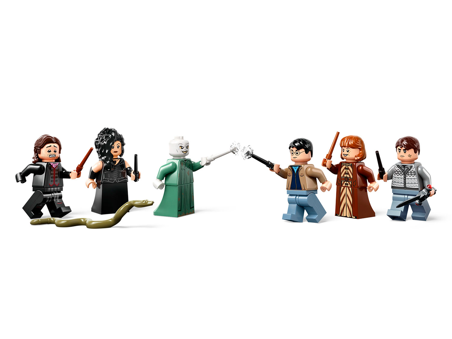 6 минифигурок LEGO® – Гарри Поттер ™ и Волдеморт ™, у каждого из которых есть волшебная палочка и элемент для произнесения заклинаний, Невилл Лонгботтом ™ с мечом Гриффиндора ™, Скабиор, Молли Уизли ™ и Беллатрикс Лестрейндж