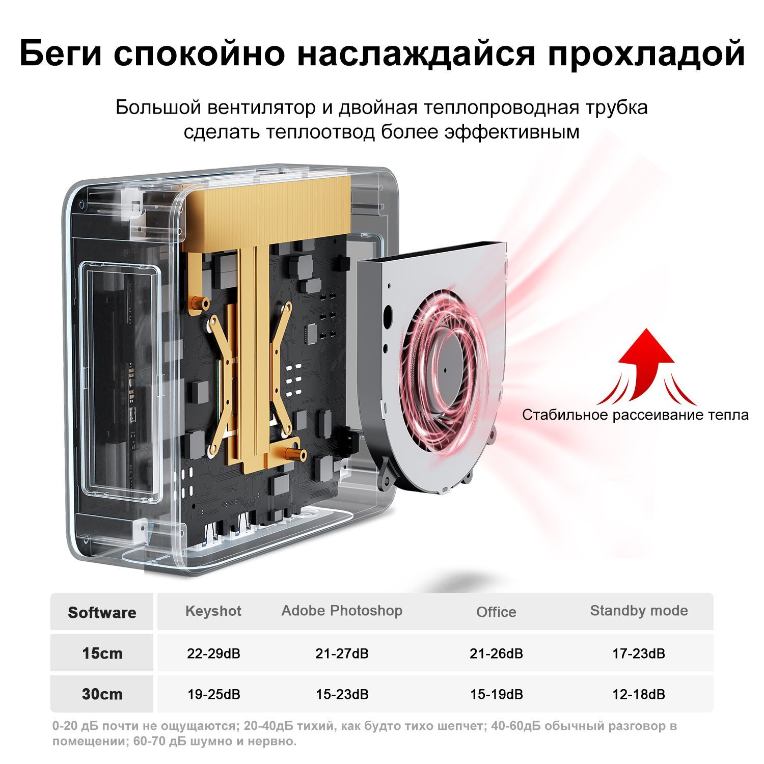 мощная система охлажденияСистема охлаждения мини-ПК 5500U состоит из большого вентилятора и двойных тепловых трубок. Он остается тихим даже при полной нагрузке, эффективно снижая температуру процессора.