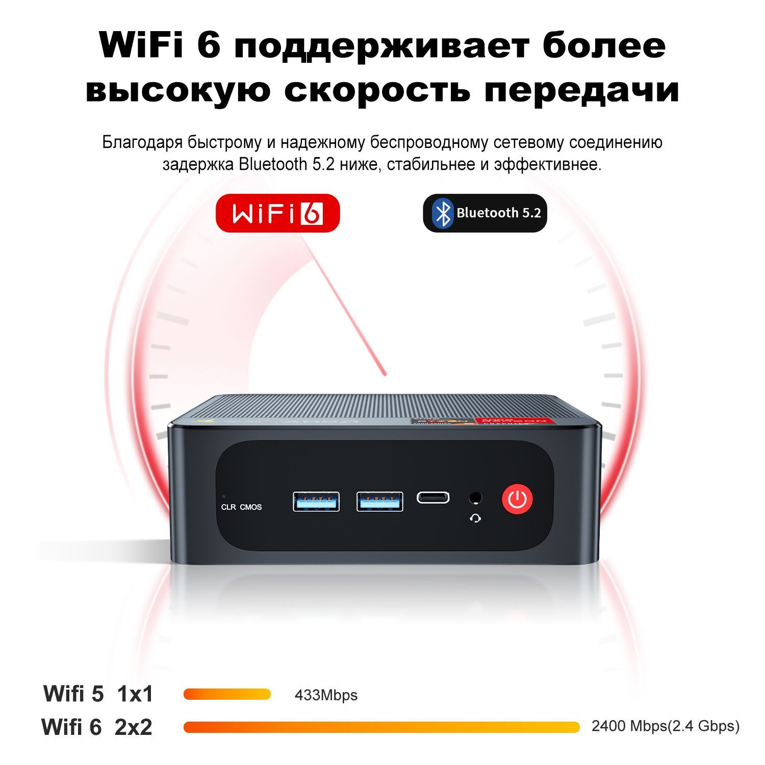 WiFi6 & BT5.2Мини-компьютеры 5500U оснащены обновлением скорости WiFi 6 до 2,4 Гбит/с (802.11ax), быстрее, чем обычный WiFi 6E, и в 3 раза быстрее, чем WI-FI 5, а задержка сокращается более чем на 75%, что ускоряет загрузку и передачу, а встроенный Bluetooth5.2 более стабилен и эффективен.