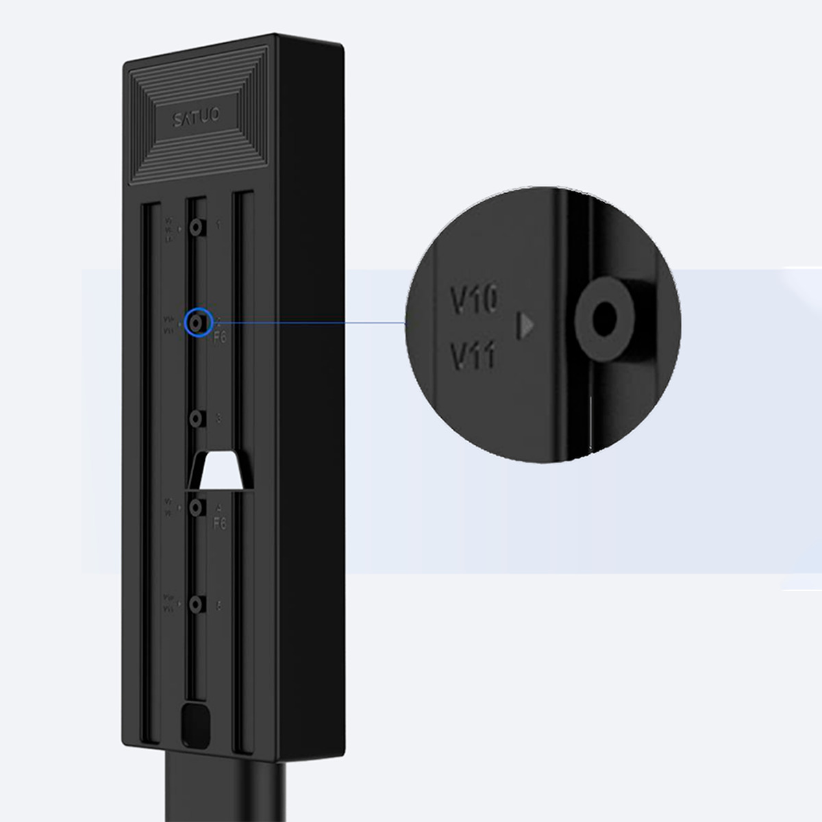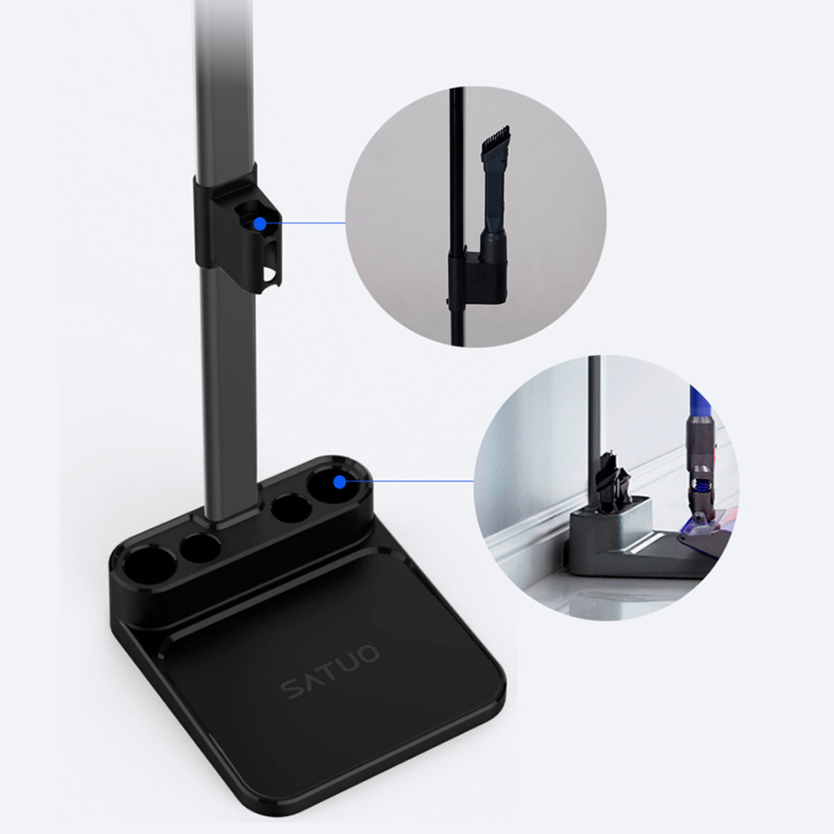 Преимущества подставки заключается в ее изящном виде, простой сборке и легкости перемещения для установки в нужном месте. Теперь не нужно сверлить стены и портить интерьер стен, достаточно найти подходящее место в квартире и установите стойку. Стойка для дайсон оснащена антискользящими наклейками, которые фиксируют стойку на одном месте и не оставляют после себя царапины. С помощью скрытых пазов можно организовать хранение кабеля зарядки для пылесоса и провести провод прямо к пылесосу. Модель стойки универсальна и подходит к основной линейке вертикальных пылесосов Daison V7, V6, V8, V9, V10, V11, V12, V15, Hassi F6, F6+.